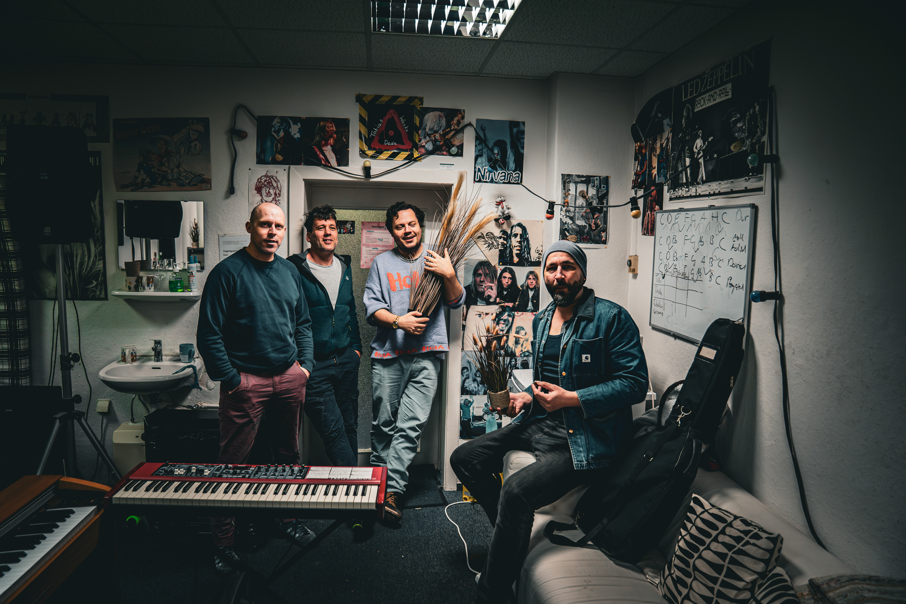 Im Gespräch wird schnell klar, dass bei ihnen vieles aus dem Moment heraus entsteht. Die Songs kommen mit wenig Text aus – oft beginnt alles mit einer Idee, die sich im gemeinsamen Spiel weiterentwickelt, fast wie ein intensiver Jam. Wann ein Stück fertig ist? Dann, wenn es sich „rund“ anfühlt. Wobei einige aus der Band sagen würden: Eigentlich ist ein Song nie ganz abgeschlossen.